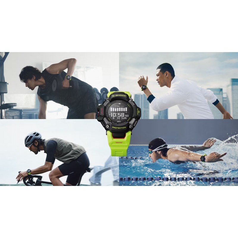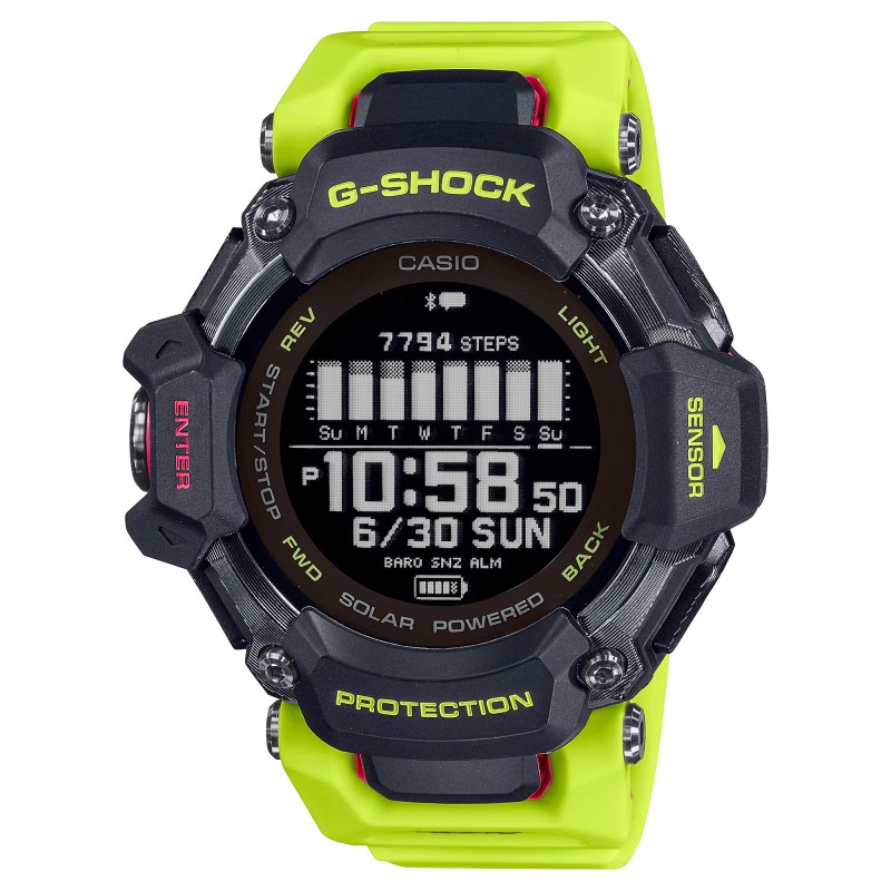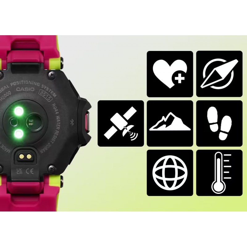 Avec la G-SQUAD GBD-H2000 - une sélection de montres multisports G-SHOCK avec cardiofréquencemètre et GPS - tu peux aller encore plus loin. Cette montre est dotée de nombreuses fonctions qui permettent de suivre tous les types d'entraînement. Mesure ta fréquence cardiaque avec le capteur optique, utilise l'accéléromètre pour compter les pas ou fais de la natation. Les capteurs peuvent accéder à la bibliothèque Polar Smartwatch pour analyser l'entraînement et le niveau de récupération après le sommeil. Que tu fasses de la course à pied, du vélo ou de la natation, cette montre est indispensable et t'équipe au mieux pour chaque sport. La bande est fabriquée à partir de plastique de biomasse de maïs, un matériau organique renouvelable. Recharge-la via USB ou à l'aide de l'énergie solaire et reste dans le coup !